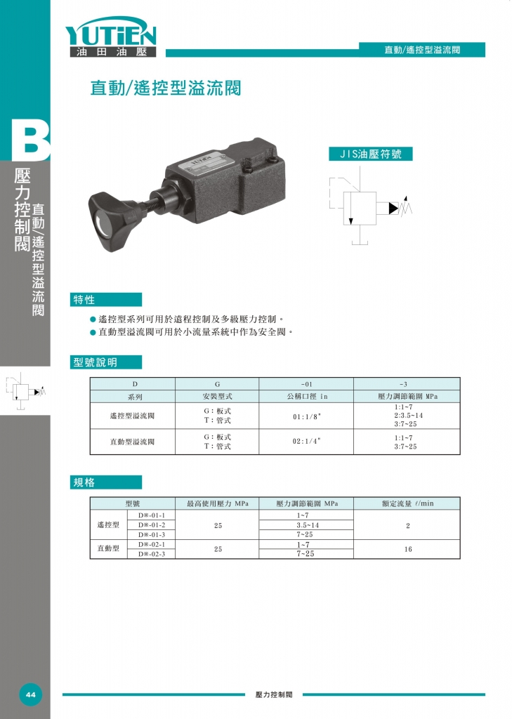 YUTIEN直動(dòng)式溢流閥常規(guī)型號(hào)參考:DG-02-1 , DG-02-3 ,DT-02-1 , DT-02-3 ,