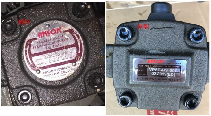 b∶原裝VP5F系列(右),警示勿動標(biāo)示標(biāo)志清楚,如圖右A,且不易掉落。油口堵頭特意設(shè)計(jì)內(nèi)六角,邊緣有大凸起有齒紋,如圖右A,方便取出。且堵頭上有英文標(biāo)示ANSON(上圖右為堵頭LOGO特寫)。